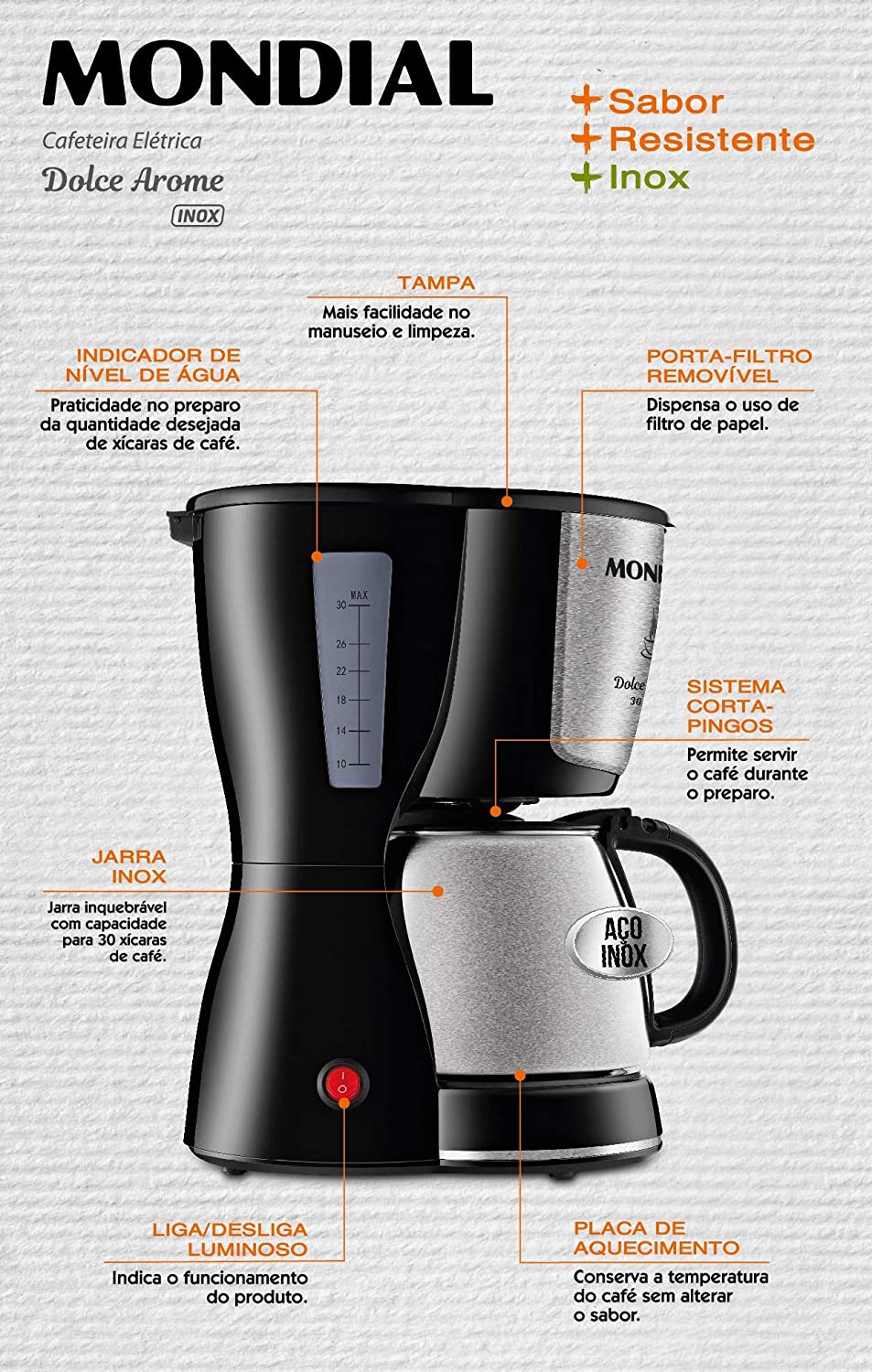 CAFETEIRA ELETRICA MONDIAL FAZ 30 XICARAS - 220V - PRETA/INOX