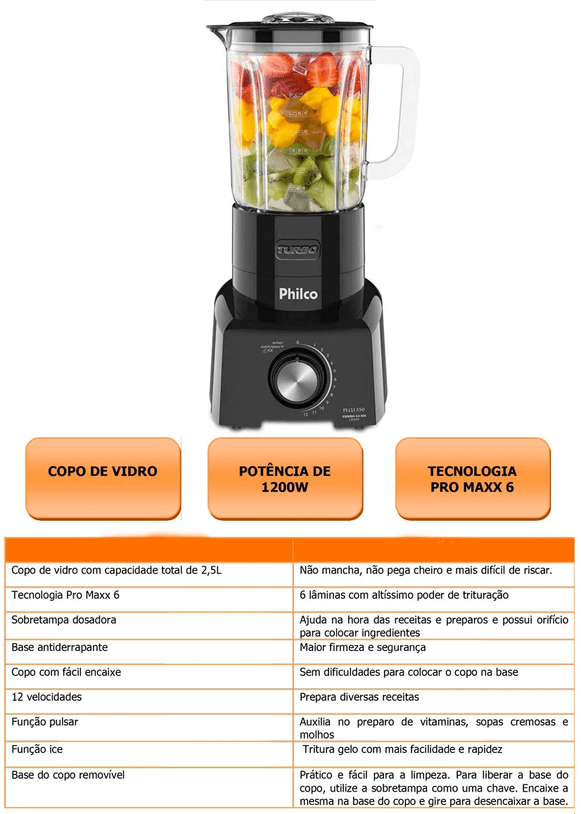 LIQUIDIFICADOR ULTRA TURBO 1200W COPO DE VIDRO PHILCO