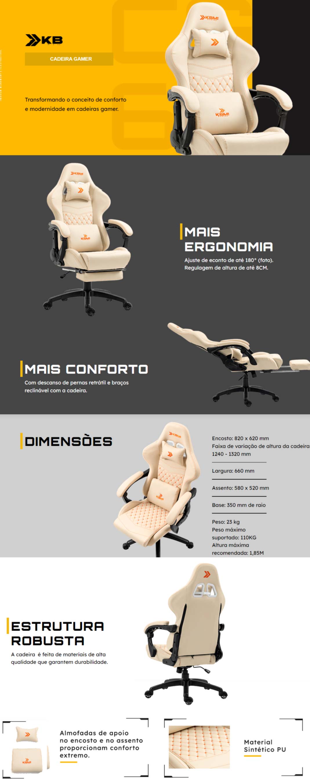 Conheça a cadeira Gaming Tenha horas incríveis desfrutando seu gameplay de maneira confortável e aconchegante! Feito com espuma de altíssima densidade e PU, a cadeira KB possui descanso para os pés, ideal para aquela pausa entre um jogo e outro! Além do design moderno e robusto, a cadeira proporciona ótima performance nas partidas devido a sensação de conforto que é convertida em foco e concentração, tudo que um gamer de verdade precisa para ser o melhor! Conforto de um assento firme com um apoio para cabeça e almofada para as costas oferecem um conforto prolongado. Muitos benefícios, possibilitando as mais diversas posições para jogo, conforto e descanso. Reclinação em até 180º e apoios de braços que acompanham a reclinação da cadeira, possibilitando as mais diversas posições para jogo, conforto e descanso. Com a KB GAMING sinta a liberdade de rodar por aí, com rodízios com perfil esportivo, em PP, que garantem fluidez de movimento. Aproveite ao máximo todos os momentos em sua cadeira KB com conforto, fluidez e design que realçam ainda mais seu setup gamer!