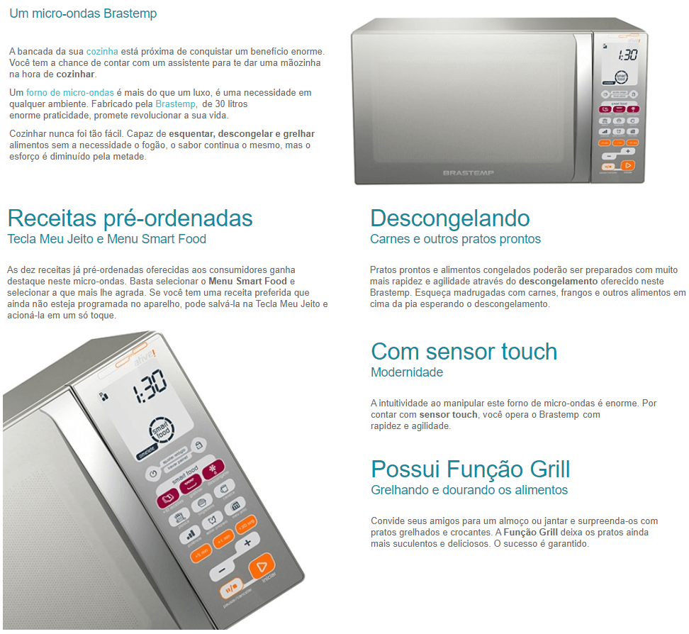 O micro-ondas Brastemp 38 Litros possui monitor de LCD com Painel Sensor Touch e tecnologia Grill que garantem maior performance nas suas receitas. Encontre o que procura com a linha de micro-ondas Brastemp. Tudo o que você quer, na hora em que querer, sem que precise se preocupar com nada. Agora você pode usar as suas funções, sem precisar do manual. Isso porque é o único que tem soluções rápidas e inteligentes que pensam pelo cliente e acompanham o dia a dia corrido em apenas um toque. Brastemp. Praticidade e qualidade em um único eletrodoméstico! Disponivel em modelos de 30 ou 38L