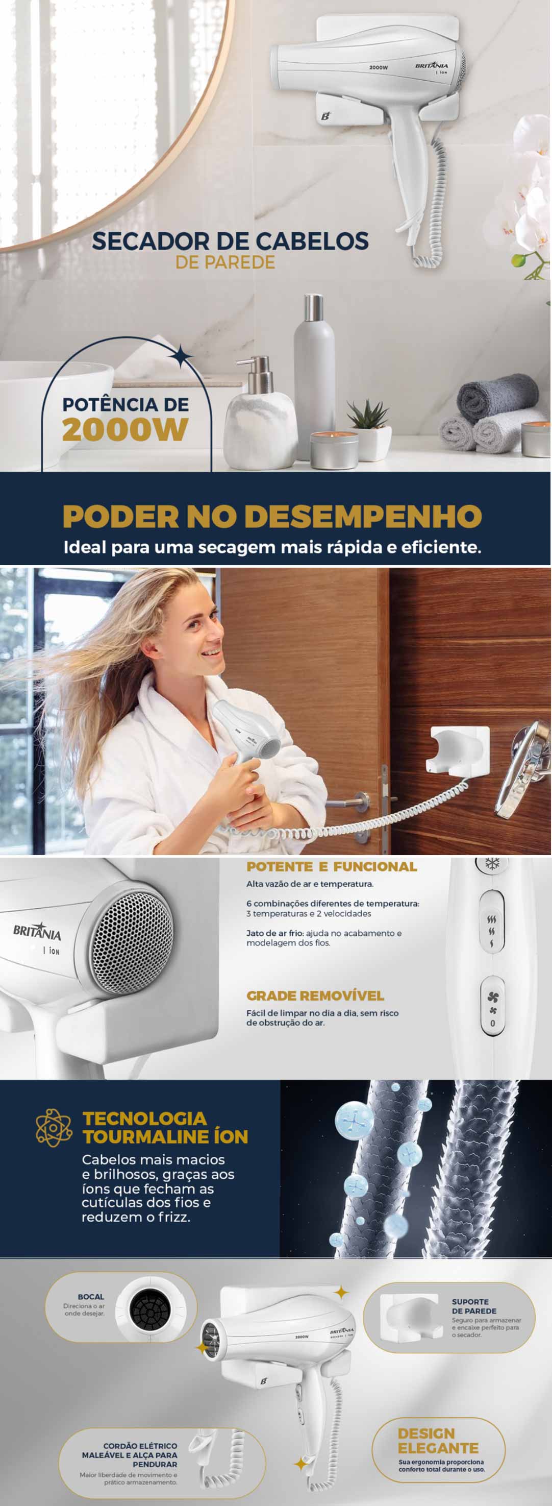 Secador de Cabelo de Parede Britania 2000w Luxx White 127V