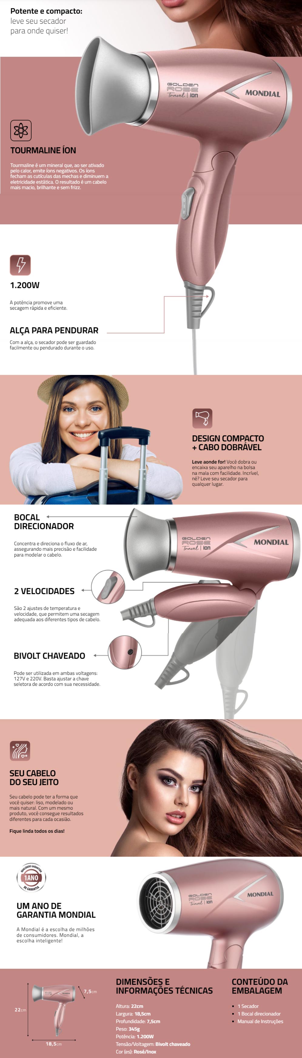 Secador de Cabelos Mondial Viagem Bivolt Mini Tourmaline Ion
