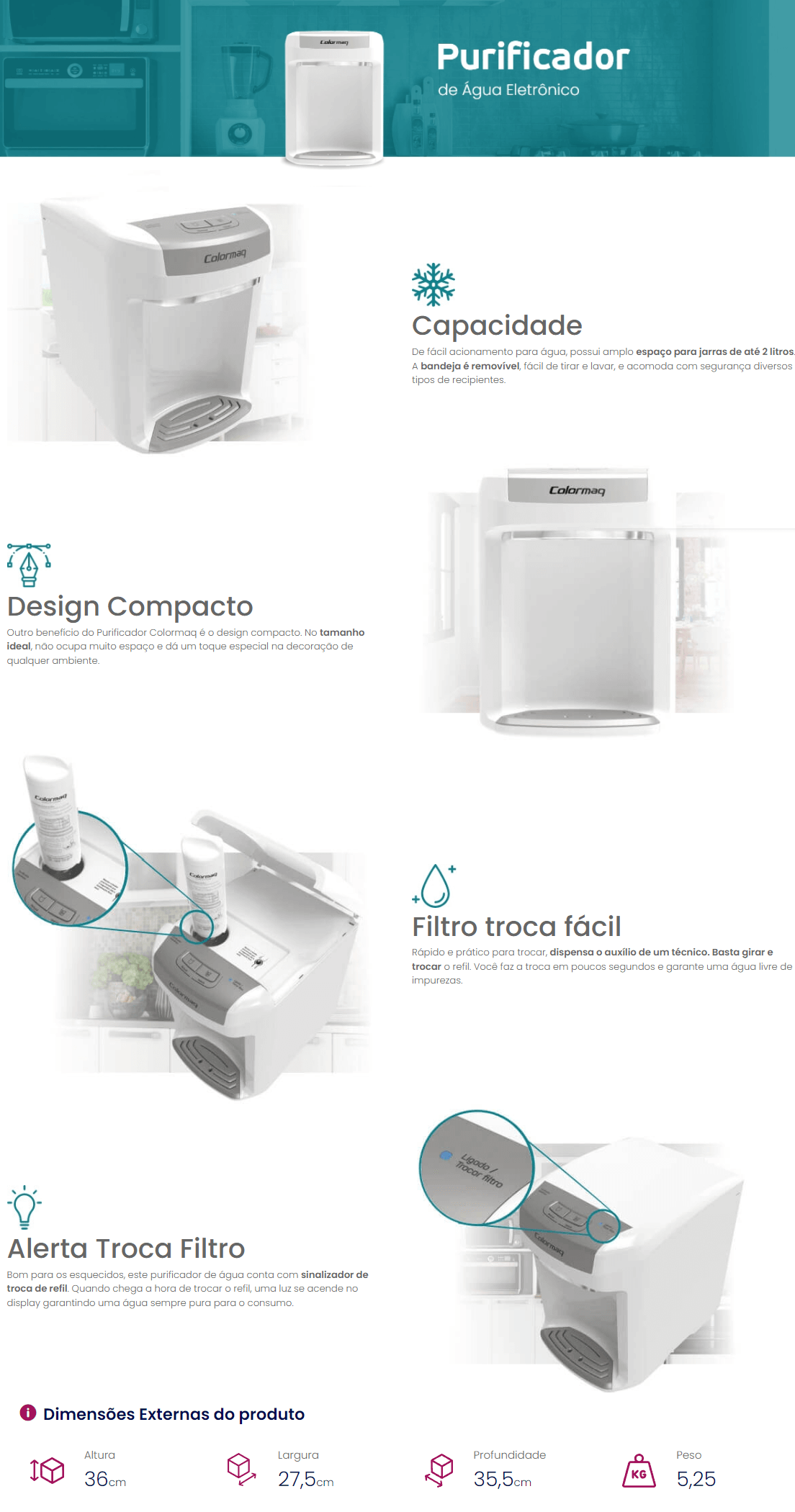 PURIFICADOR DE AGUA COLORMAQ ELETRONICO 66W C/ FILTRO P/ 6 MESES