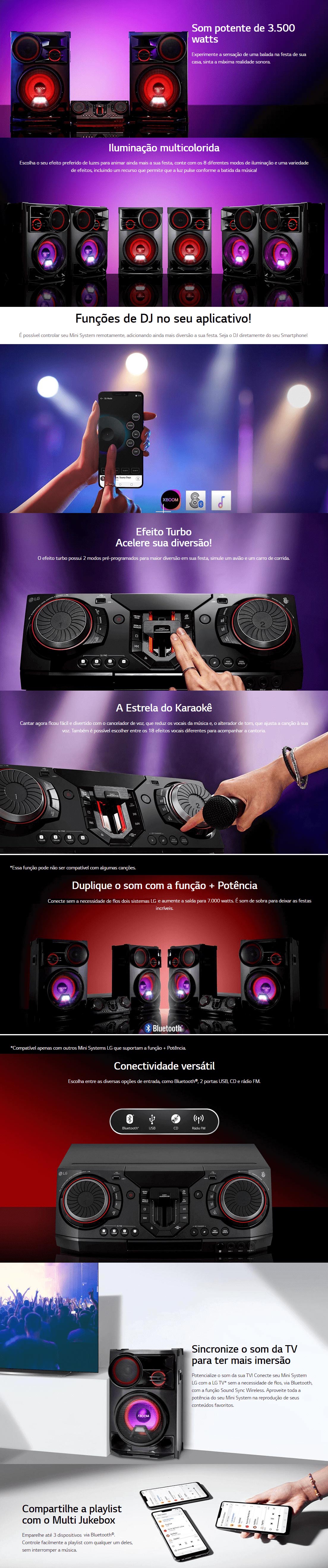 O Mini System LG é a escolha perfeita para você! Moderno, ele têm 3500W RMS de potência, trazendo design e tecnologias inovadoras, através das cornetas e Woofer com Mica Plus, que proporcionam um som mais nítido e com alta fidelidade nas frequências altas e baixas, suprimindo as distorções. Você pode ser o DJ da sua festa, pois pode entreter os seus amigos com ferramentas fáceis de usar e efeitos de qualidade profissional. O Mini System LG adiciona até 5 efeitos às suas músicas de forma manual (Flanger, Phaser, Wah, Delay e Scratch) e permite que você insira vozes pré-estabelecidas com o DJ Pro. Com o aplicativo LG Music Flow Bluetooth, é possível controlar seu CL98 remotamente, adicionando ainda mais diversão a sua festa. Controle todos os recursos DJ, a iluminação e grave em um dispositivo suas músicas criadas, tudo através do seu Smartphone. Pareie até 3 dispositivos móveis.simultaneamente para que a sua festa seja um sucesso!