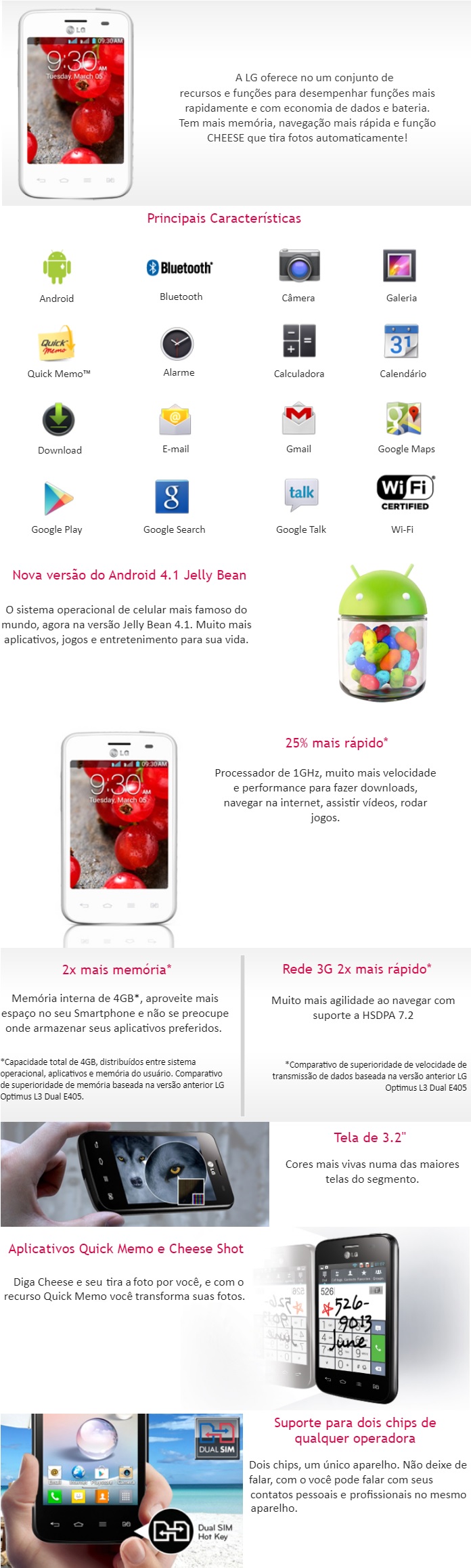 SMARTPHONE LG DUAL CHIP CAM 3MP - C/ ANDROID 4.1 TELA 3,2 - BRANCO