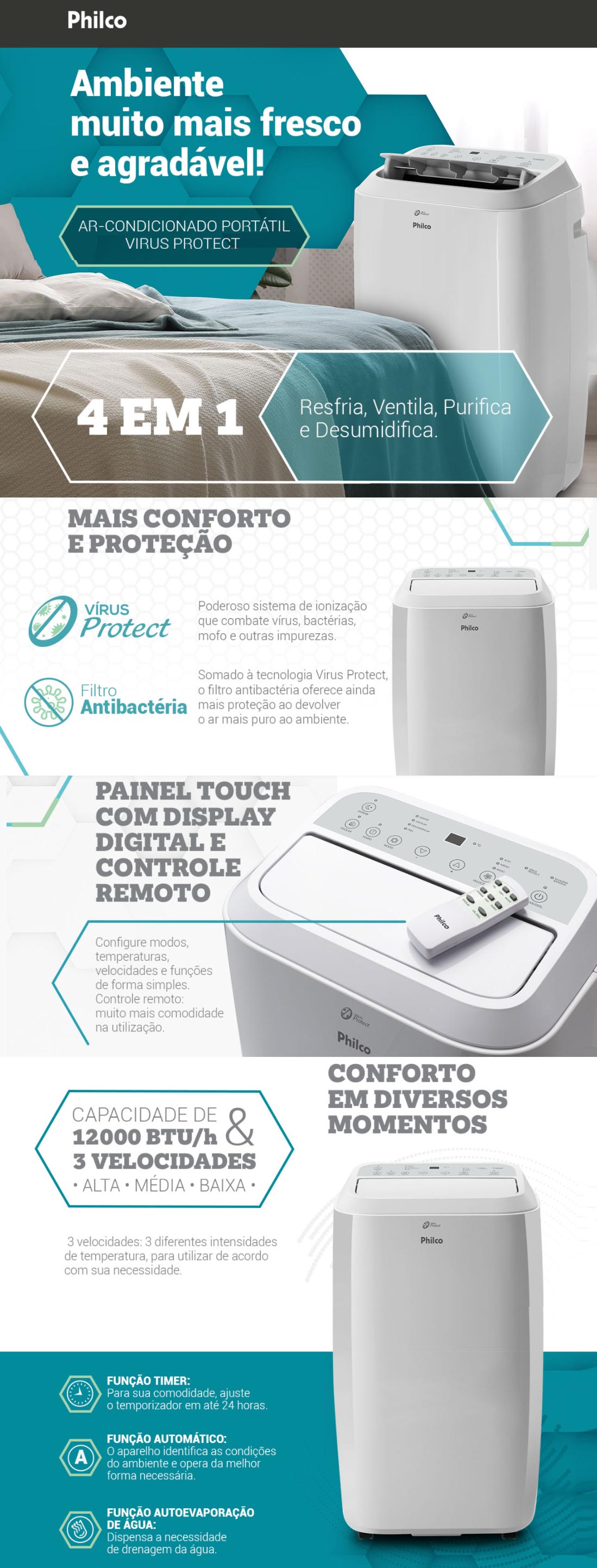 AR CONDICIONADO PORTATIL 4X1 PHILCO 10000 BTUS FRIO C/ ANTIBACTERIAS