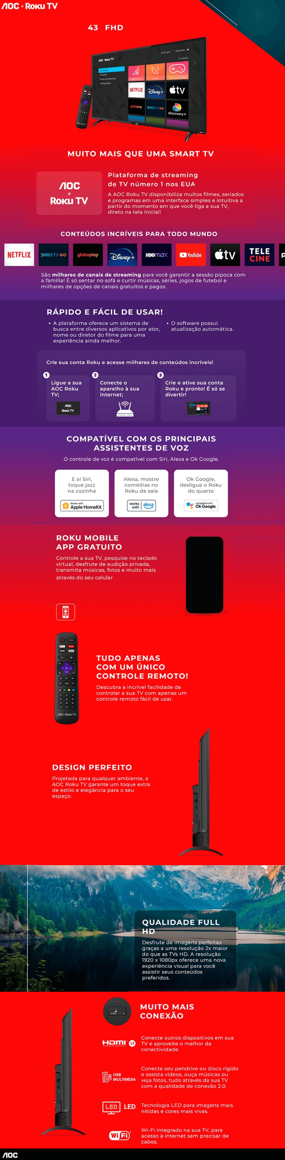 SMART TV 43 POL LED AOC FULL HD WIFI PRETA - C/ ENTRADAS HDMI E USB