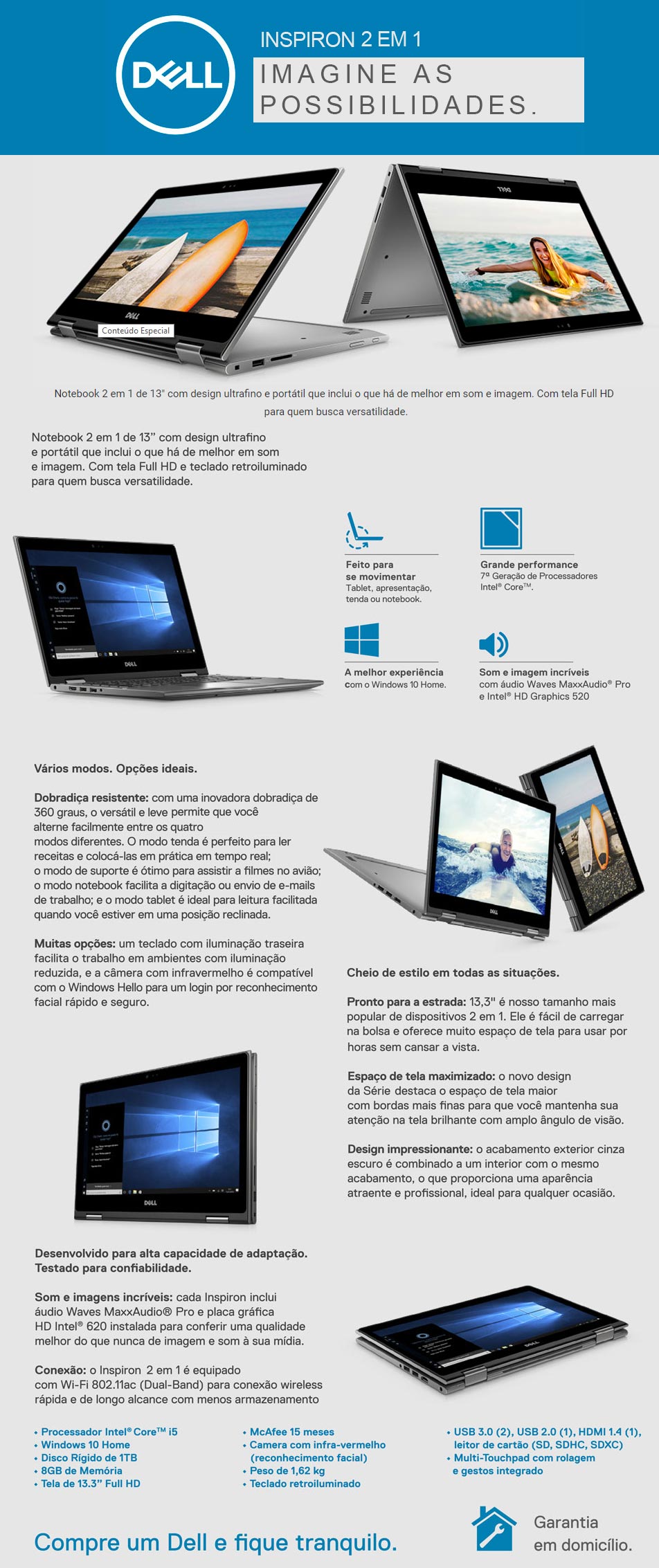 Novo Notebook Hibrido Dell com tela touch de 13,3 Full HD e disco HD de 1TB. Conta com uma inovadora dobradiça de 360 graus, o versátil e leve Hibrido da Dell permite que você alterne facilmente entre os quatro modos diferentes. O modo tenda é perfeito para ler receitas e colocá-las em prática em tempo real; o modo de suporte é ótimo para assistir a filmes no avião; o modo notebook facilita a digitação ou envio de e-mail de trabalho; e o modo tablet é ideal para leitura facilitada quando você estiver em uma posição reclinada. Muitas opções: um teclado com iluminação traseira facilita o trabalho em ambientes com iluminação traseira facilita o trabalho em ambientes com iluminação reduzida, e a câmera Hello para um login por reconhecimento facial rápido e seguro.eio de estilo em todas as situações. Pronto para a estrada: 13,3" é nosso tamanho mais popular de dispósitivos 2 em 1. Ele é fácil de carregar na bolsa e oferece muito espaço de tela para usar por horas sem cansar a vista. Espaço de tela maximizado: o novo design destaca o espaço de tela maior com bordas mais finas para que você mantenha sua atenção na tela brilhante com amplo ângulo de visão. Design impressionante: o acabamento exterior cinza escuro é combinado a um interior com o mesmo acabamento, o que proporciona uma aparência atraente e profissional, ideal para qualquer ocasião. om e imagens incríveis: inclui áudio Waves MaxxAudio Pro e placa gráfica HD Intel 620 instalada para conferir uma qualidade melhor do que nunca de uma imagem e som à sua mídia. Conexão: equipado com Wi-Fi 802.11ac (Dual-Band) para conexão wireless rápida e de longo alcance com menos armazenamento em buffer e menos quedas de conexão.
