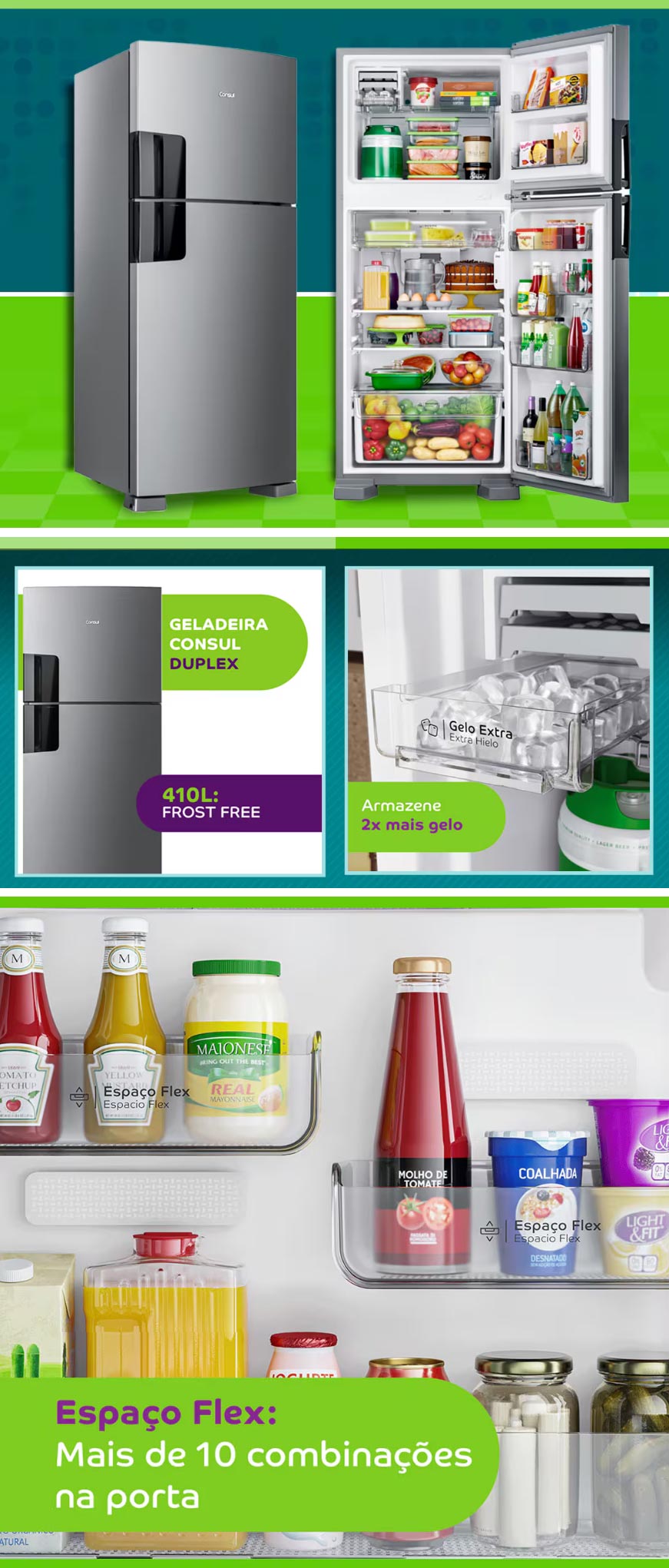 Com 400 litros de capacidade, design moderno e espaço interno bem distribuído, o Refrigerador Duplex Consul é o modelo ideal para quem deseja manter o ambiente organizado e os alimentos muito bem conservados. Frost Free, a Geladeira Consul Duplex não precisa ser descongelada nunca, pois não forma gelo nas paredes do congelador. Além disso, o freezer conta com prateleira flex, possibilitando que você organize o espaço com prateleira inteira, meia prateleira ou nenhuma. E, se você é fã de bebidas bem geladas, vai amar o compartimento de gelo extra, que possibilita armazenar gelo pronto, fora das forminhas. Outro destaque do equipamento é o Filtro Antiodor, que elimina cheiros desagradáveis na geladeira. Como tudo o que a Consul desenvolve, o espaço interno da porta dessa geladeira foi projetado de uma maneira muito bem pensada. Com 10 combinações possíveis, ela oferece praticidade no armazenamento de garrafas, jarras e tantos outros itens. Como se não bastasse, esse refrigerador ainda conta com gavetão transparente para frutas e legumes e gaveta extrafria, para os alimentos que precisam de maior refrigeração. A Geladeira oferece 410 litros de capacidade, além de um espaço flex que permite você organizar tudo do seu jeito. Nela você organiza os compartimentos da porta do jeito que preferir, e nas prateleiras do freezer você tem 3 formas diferentes para organizar. Tudo de acordo com a sua necessidade. Possui também um gavetão transparente de frutas e legumes para você organizar e visualizar os alimentos de forma prática, trazendo eficiência e praticidade para você. Além disso, o Refrigerador conta com um filtro antiodor que elimina os odores desagradáveis, principalmente aquele de água com gosto de geladeira. Essa geladeira vai além do convencional ao potencializar os nutrientes dos alimentos. Sua gaveta Fresh Zone com Vitamin Power utiliza luzes LED especiais para intensificar as vitaminas C e D, garantindo que sua família desfrute de refeições mais saudáveis e saborosas. Nutrição e praticidade em um único lugar. Possui controle de temperatura interno e para os momentos em que você precisa de resfriamento rápido, a função TURBO entra em ação, garantindo que sua geladeira mantenha a temperatura ideal mesmo quando totalmente carregada.