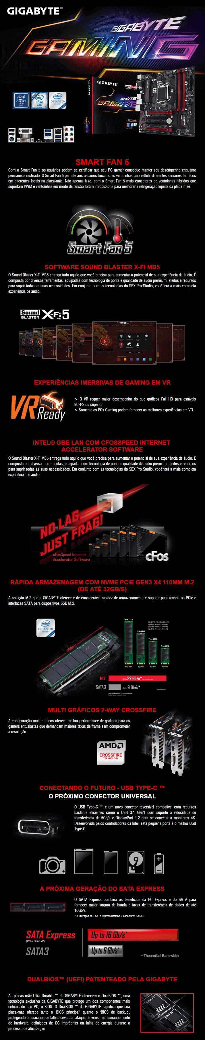 A Placa Mãe Gigabyte foi desenvolvida para dar suporte aos processadores de 7ª/ 6ª Geração Intel Core?. Além de possuir 4 slots para memórias DDR4 com arquitetura Dual Channel Non-Ecc Unbuffered. Muitos outros recursos de ponta para garantir o desempenho e qualidade com tecnologias como Intel Usb 3.1 Gen 1 com Usb Type-C?, Suporte Multi-Gráficos 2-Way CrossFire, Dual NVMe PCIe SSDs com suporte a Raid 0, Ultra-Fast M.2 com PCIe Gen3 x4 & interface Sata, Pronta para Memória Intel Optane, Software Sound Blaster X-Fi MB5, Capacitores de Áudio de Alta Qualidade e Audio Noise Guard com Luzes de Led, Intel GbE Lan com cFosSpeed Internet Accelerator Software, Smart Fan 5 com múltiplos sensores de temperatura e fan headers híbridos, App Center incluindo o utilitário Cloud Station.