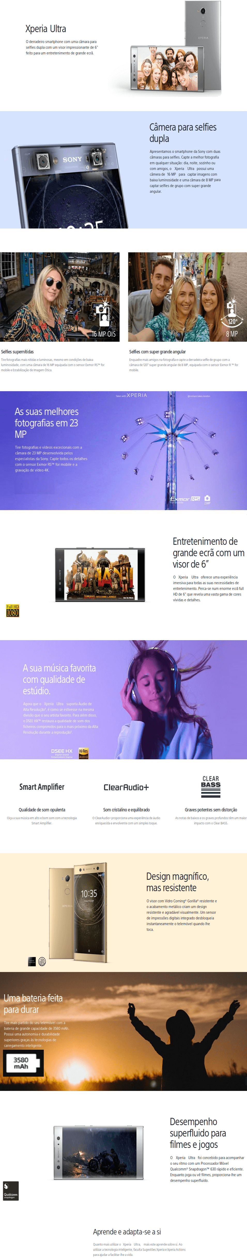 Mergulhe no incrível mundo do entretenimento capacitado pelas tecnologias da Sony. Com a câmera e a tela HDR, tudo fica mais incrível. O Sony Xperia 2019 é um bom celular Android com processador que permite rodar jogos e aplicativos pesados. Com um slot para cartão SIM, o Sony Xperia 2019 permite download de até 600 Mbps para navegação na Internet, mas isso também depende do operador móvel. Ótima conectividade deste terminal que inclui Bluetooth versão 5.0, WiFi + MIMO e NFC para efetuar pagamentos e permite conexão a outros terminais. Incluindo a bateria, o celular Sony Xperia 2019 tem 221 gramas e é um terminal muito fino com apenas 9,5 mm. O melhor smartphone com câmera de selfie dupla e uma impressionante tela de 6” feita para o entretenimento de tela grande. A câmera dupla para selfies Apresentamos o novo smartphone da Sony com duas câmeras para selfies. Consiga a melhor foto em qualquer situação: de dia, à noite, sozinho ou com os amigos. O Xperia XA2 Ultra tem uma câmera de 16MP para imagens com pouca luz e uma câmera de 8MP para selfies de grupo superamplas. Entretenimento de tela grande em 6" O Sony Xperia 2019 oferece uma experiência imersiva de entretenimento para todas as suas necessidades. Curta a enorme tela Full HD de 6" que mostra uma grande variedade de cores nítidas e detalhadas. Desempenho ótimo para filmes e jogos O Sony Xperia 2019 foi criado para acompanhar você com a rápida e eficiente Qualcomm Snapdragon 630 Mobile Platform. Desempenho eficiente para filmes e jogos