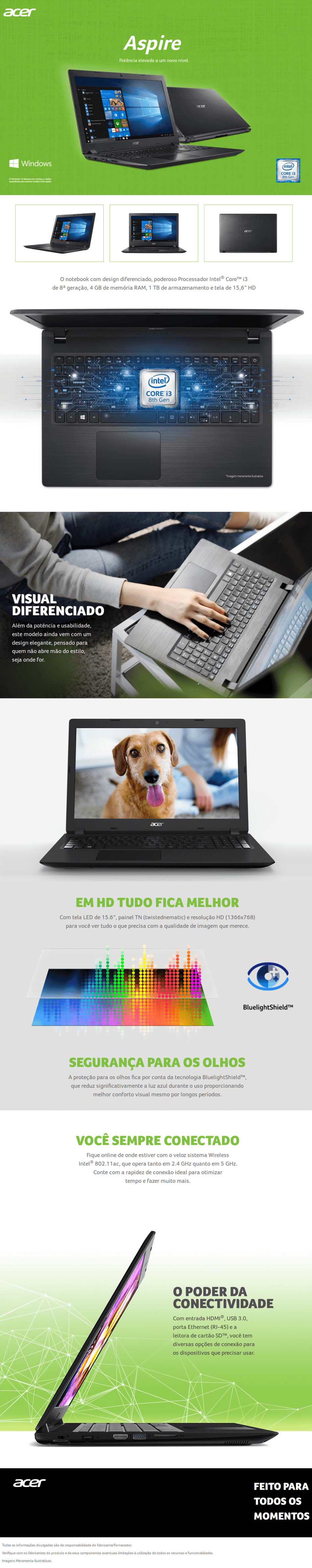 NOTEBOOK ACER INTEL CORE i3 4GB RAM HD 1TB TELA LED 15.6 LED WIN 10