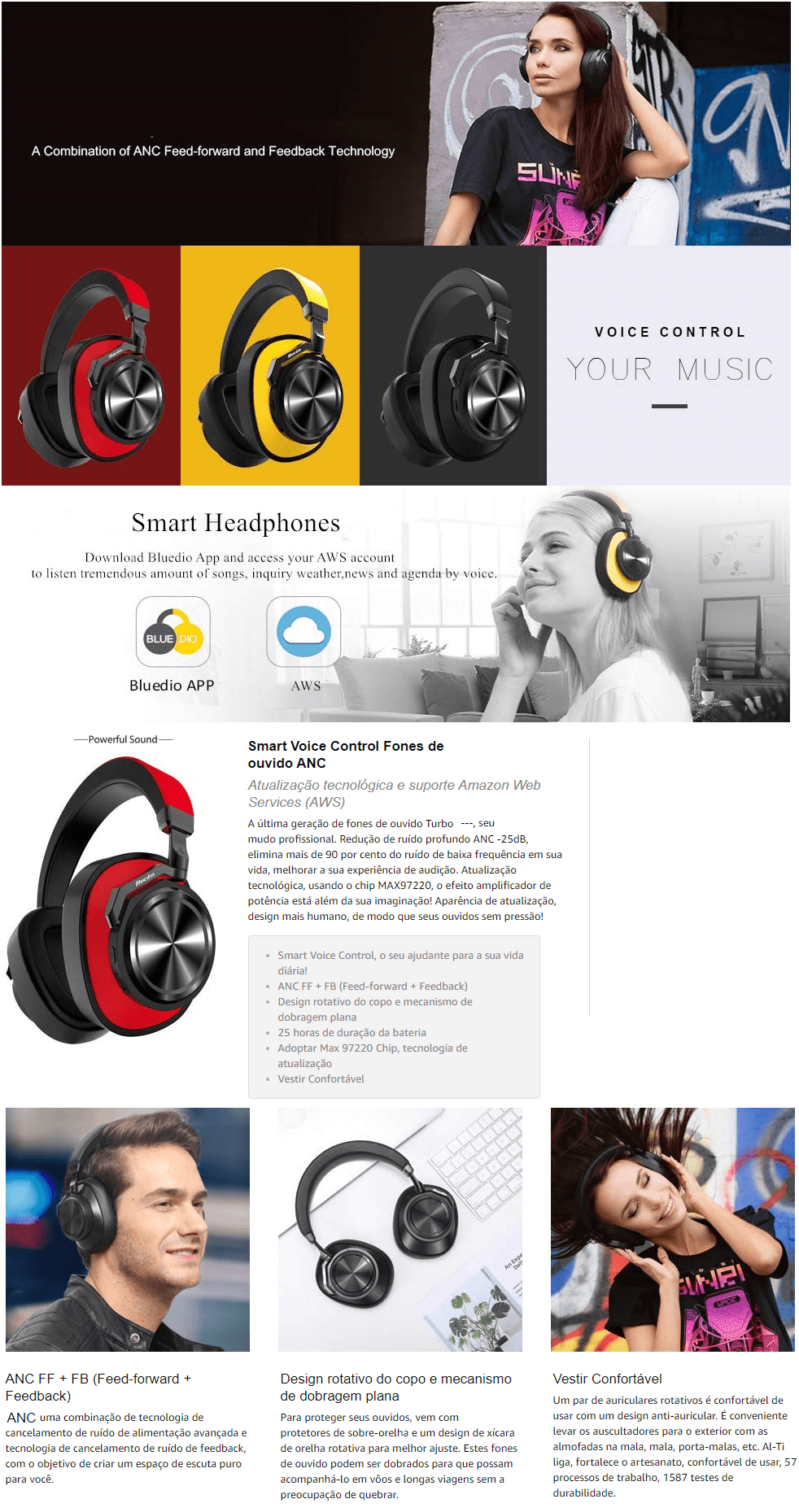 Suporte Amazon Web Services, baixe Bluedio App e acesse sua conta AWS para ouvir uma quantidade enorme de músicas, informações sobre o tempo, notícias e agenda, controle de voz do eletrodoméstico, fones de ouvido Bluedio torna-se o ajudante para a sua vida diária. Mais simples na aparência, com apenas uma tecla de alternância e nenhum botão de volume. Se você precisar ajustar o volume, ajuste o volume do seu dispositivo.