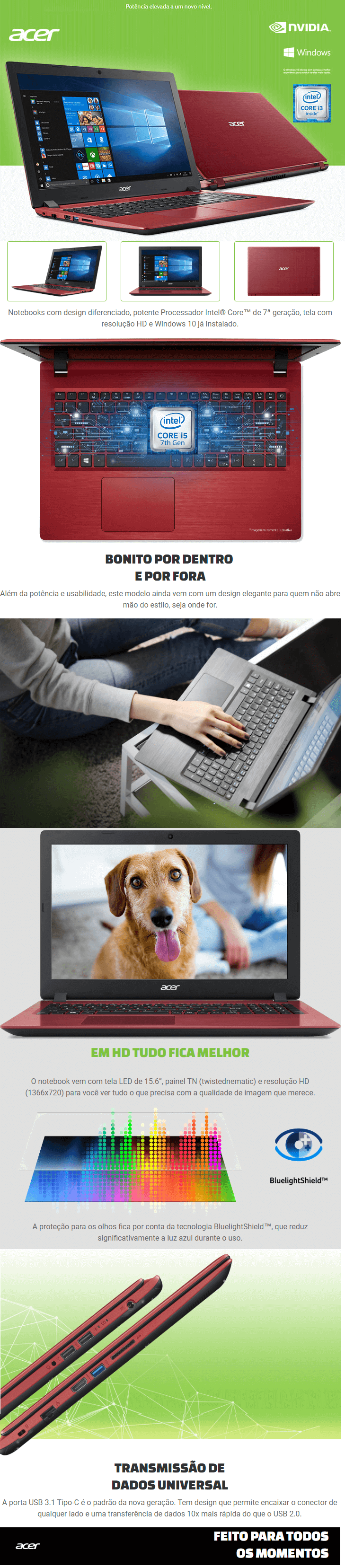 NOTEBOOK ACER INTEL CORE i5 HD 1TB 4GB RAM TELA 15 USB 3.0 WIN10 - RED