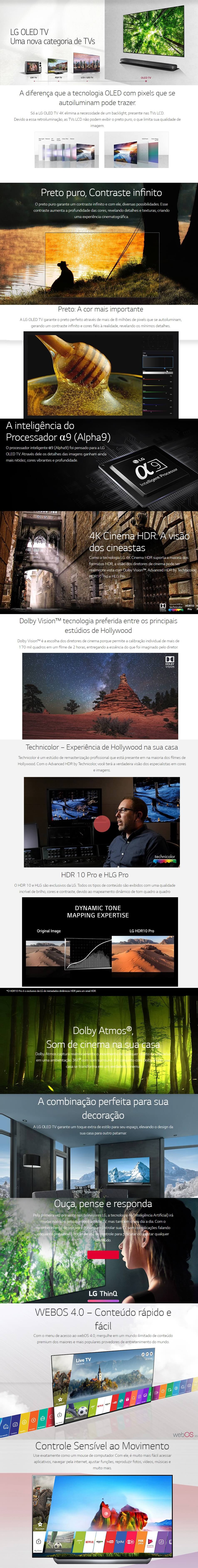 Pixels que se auto iluminam a TV OLED, é diferente de tudo que você já viu. Com uma tecnologia onde os pixels emitem luz individualmente, é possível alcançar o preto puro e reproduzir cores perfeitas. E por não precisar de um painel traseiro de iluminação, conta com um design Ultra Slim que entrega requinte e sofisticação para qualquer ambiente. Contraste infinito, o contraste infinito entrega imagens mais nítidas sem nenhum vazamento de luz, mesmo em cenas extremamente claras. Tenha a melhor reprodução de todo o espectro de luz. Preto puro, Cores perfeitas, o preto puro garante um contraste infinito e com ele, diversas possibilidades. Esse contraste aumenta a profundidade das cores, revelando detalhes e texturas, criando uma experiência cinematográfica. Cores perfeitas, as cores perfeitas só são possíveis através da reprodução do preto puro. A LG OLED AI TV consegue reproduzir fielmente toda a gama de cores dos seus conteúdos, entregando grande realismo e profundidade para suas imagens. Resolução Ultra HD 4K Novo padrão de alta resolução, o Ultra HD 4K é o futuro da definição de imagem. Com mais de 8 milhões de pixels, você pode desfrutar de imagens com um nível incrível de detalhes e ter telas maiores em ambientes menores. Um novo cérebro, a7, processamento avançado de imagens, processador Inteligente A7, otimizado para LG OLED AI TV. O processador exclusivo da LG TV permite a qualidade de imagem premium, proporcionando uma experiência de visualização mais clara e brilhante. 4K Cinema HDR da LG, como a tecnologia LG Cinema HDR suporta a maioria dos formatos HDR, a visão dos diretores de cinema pode ser realmente vista com Dolby Vision, Advanced HDR by Technicolor, HDR10 Pro e HLG Pro. 4K Cinema HDR com o HFR (High Frame Rate), a LG OLED AI TV suporta conteúdos de até 120 frames por segundo, mantendo a imagem mais fluida e nítida, sem distorção, mesmo em movimentos muito rápidos Dolby Atmos, Som de Cinema em Casa, a tecnologia Dolby Atmos cria um som potente e envolvente que flui a 360 graus, até no espaço acima, captando o movimento de todos os objetos. Com a Dolby Vision terá acesso a uma experiência verdadeiramente cinematográfica. A LG OLED AI TV proporciona um novo jeito de ver TV. Com reconhecimento de voz, você consegue controlar sua TV sem complicações. Procure por qualquer informação ou conteúdo que quiser, basta apenas falar. Essa excelente inovação entrega ainda mais conveniência para seu lazer. Smart TV Webos 4.0, a evolução da melhor plataforma Smart do mercado. Mais rápido e muito mais intuitivo, o webOS conta com diversas funções novas e entrega uma melhor experiência para o consumidor. Design Cinema Screen, a espessura do painel de OLED é muito menor pois ele não precisa de um painel traseiro de iluminação. O resultado é um painel extremamente fino com acabamento premium e que fica muito mais próximo da parede, combinando com a decoração da sua casa.