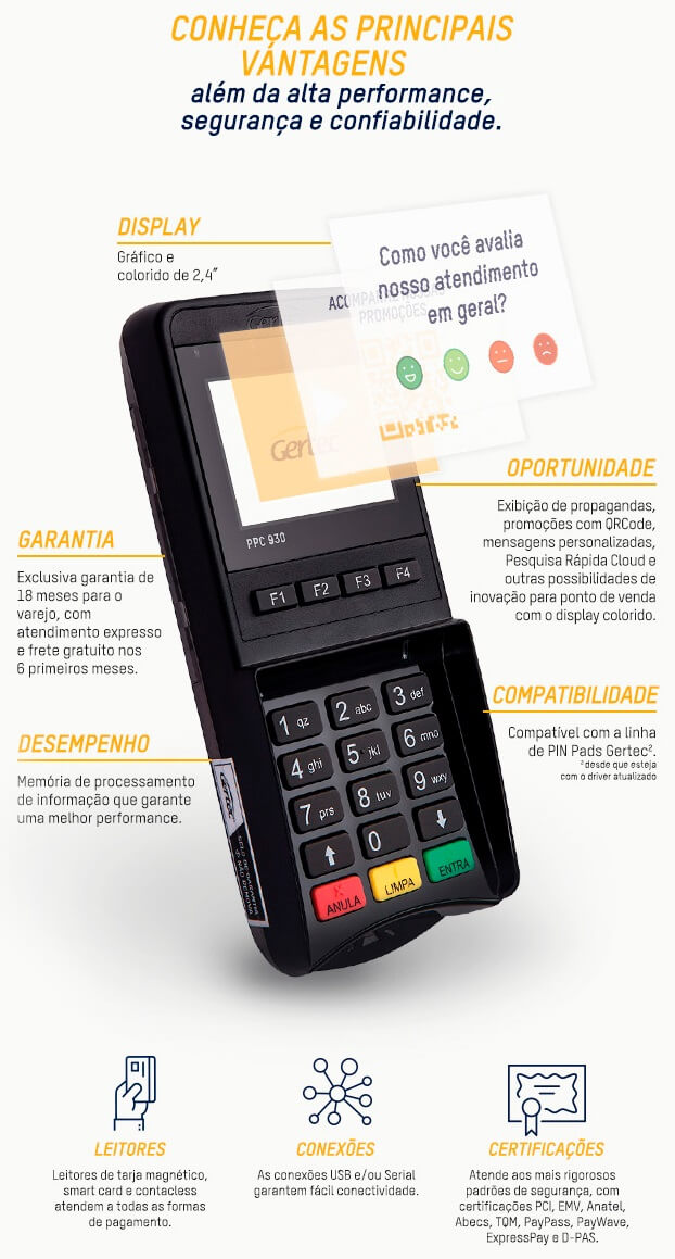 Certificações: PCI-PTS3.X; EMV 4.0 L1 e L2; TQM; EMVCL L1 e L2; Visa payWave, MasterCard PayPass, American Express Expresspay
