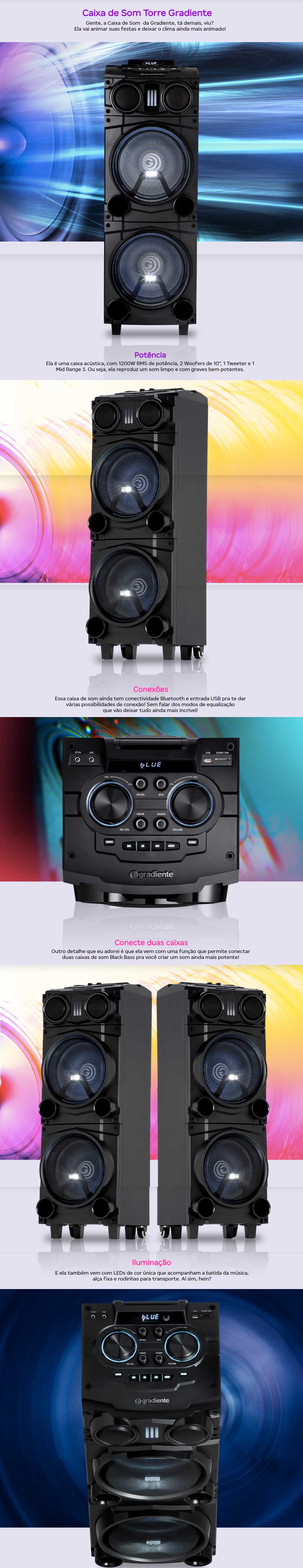 A Caixa Amplificada Mini System TorreBox da Gradiente traz a pureza original da música através de seus graves épicos e agudos nítidos proporcionando qualidade e sofisticação em qualquer ambiente. Ela conta com conexão Bluetooth, LEDs que acompanham a batida da música, entrada P2 auxiliar, 2 entradas P10 para microfone e guitarra, painel de controle e ainda função Gradiente Connect que permite conectar duas torres de som GDB10M, criando um efeito estereofônico que aumenta a potência sonora do ambiente. Além disso, possui fácil transporte com alça fixa e rodinhas nos pés e gráfico luminoso animado que acompanha a batida da música. A caixa de som amplificada oferece graves épicos para que a sua festa seja completa e com a inconfundível qualidade sonora GRADIENTE. São 1.800W de potência, para uma experiência de som incrível para curtir suas músicas preferidas. O acabamento em madeira da caixa amplificada Gradiente traz uma melhor fidelidade dos áudios e maior durabilidade ao produto. Um efeito de iluminação inconfundível e de impacto. Os LEDs ritmíticos que alteram conforme as batidas das músicas. Além de possuir também um espectro de LED na parte frontal, com gráfico luminoso que acompanha as batidas das músicas favoritas. Para mais diversão, essa caixa de som conta com 2 entradas P10, uma para guitarra e outra para microfone. Controle volume do microfone, guitarra e da caixa de som separadamente. O controle de graves e agudos melhoram a qualidade sonora e fidelizam o áudio de acordo com a sua preferência. A função Gradiente Connect (TWS) permite que conecte 2 torre de som para potencializar ainda mais o som da sua festa e oferecer uma melhor experiência sonora. Fácil de transportar, ela tem rodinhas e alça para levar para onde for.